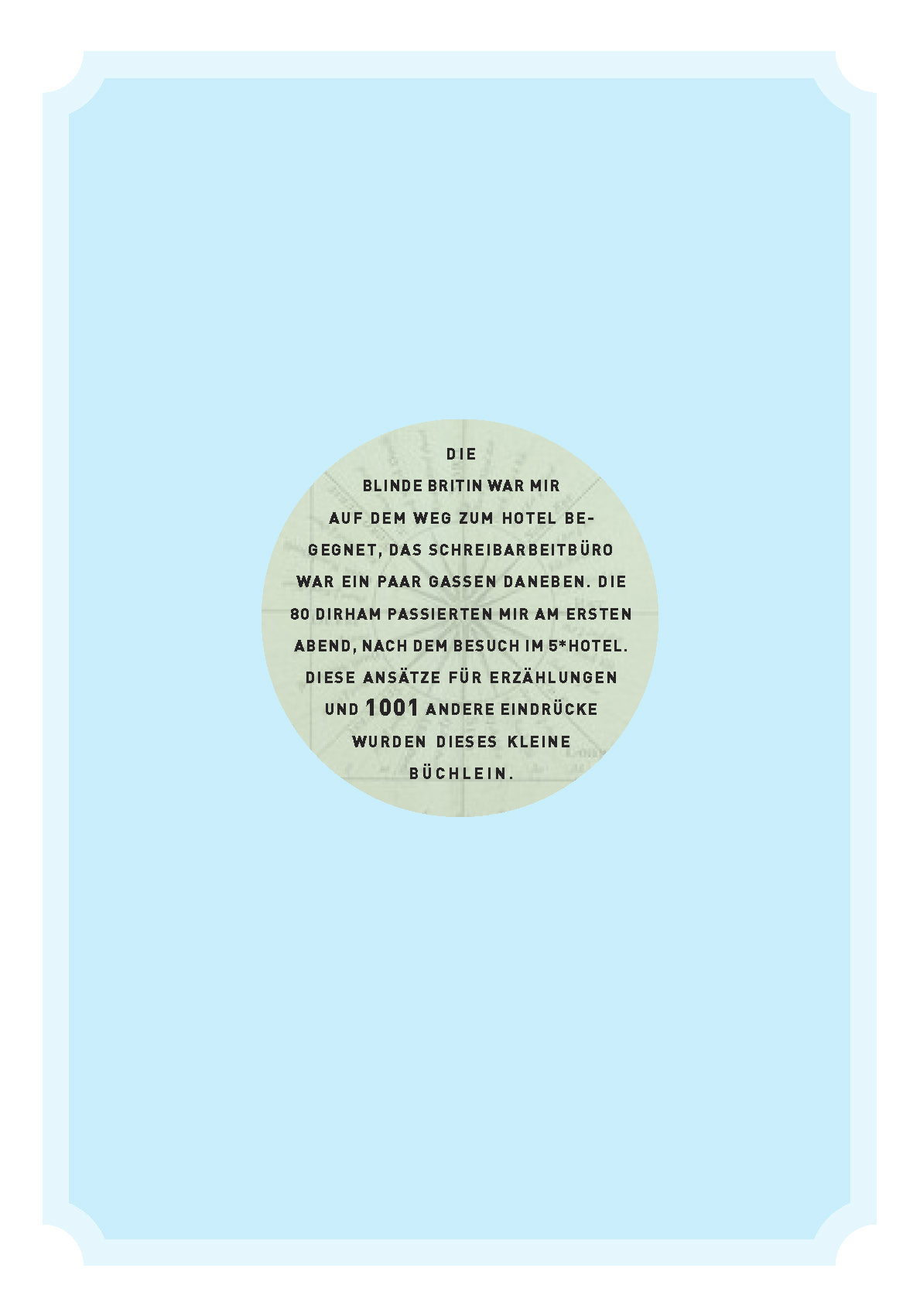 “Ich weiß, du hast keine Ahnung, wer ich bin, obwohl ich mehrere Dutzend Male schon vor dir stand. Es ist ein Segen und ein Fluch einen streng sunnitischen Vater zu haben, der mir vorgeben darf, was ich zu tragen habe. Der Segen an diesem Fluch ist, dass ich unerkannt durch die Gassen des Souks und über die Djemaa flanieren kann, solange ich einen Grund dafür vorgebe: Besorgungen für den Haushalt gibt es immer zu erledigen. Und so habe ich dich oft und unerkannt beobachtet.